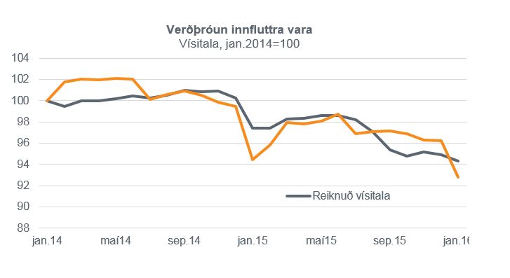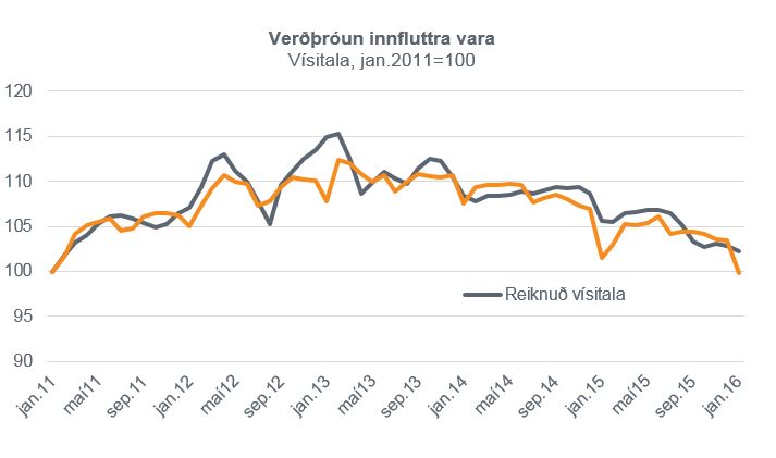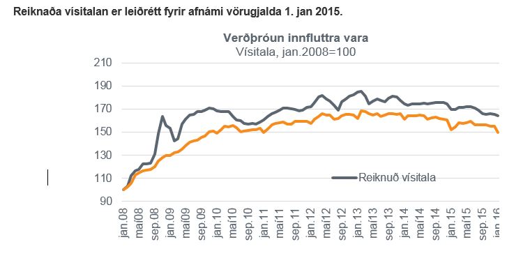 Reiknaða vísitalan er leiðrétt fyrir afnámi vörugjalda 1. jan 2015.